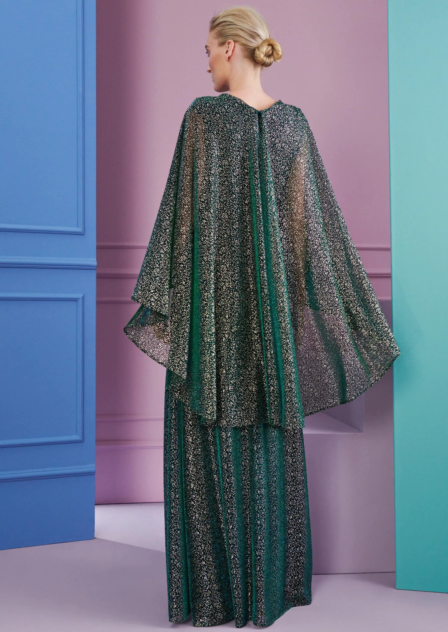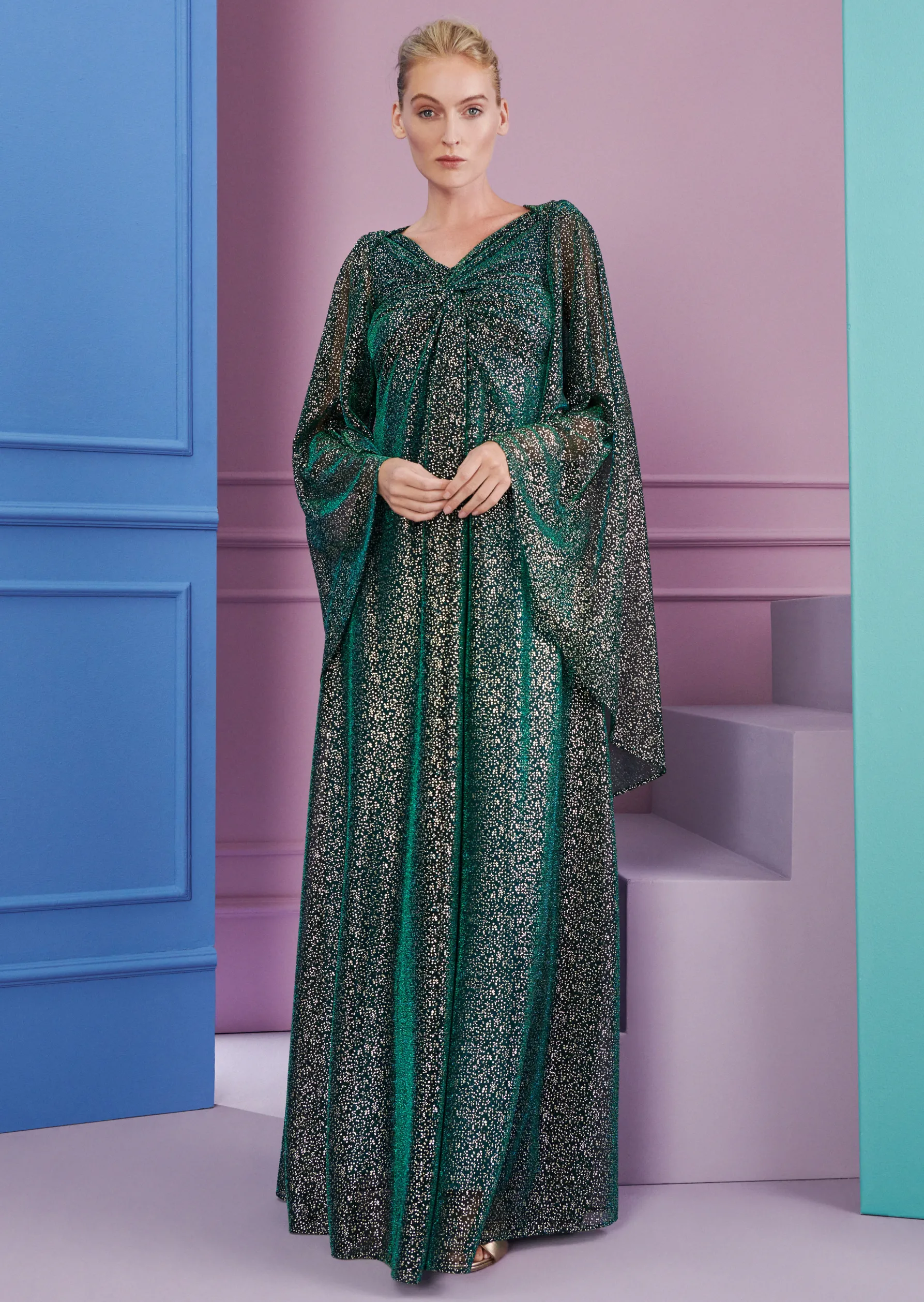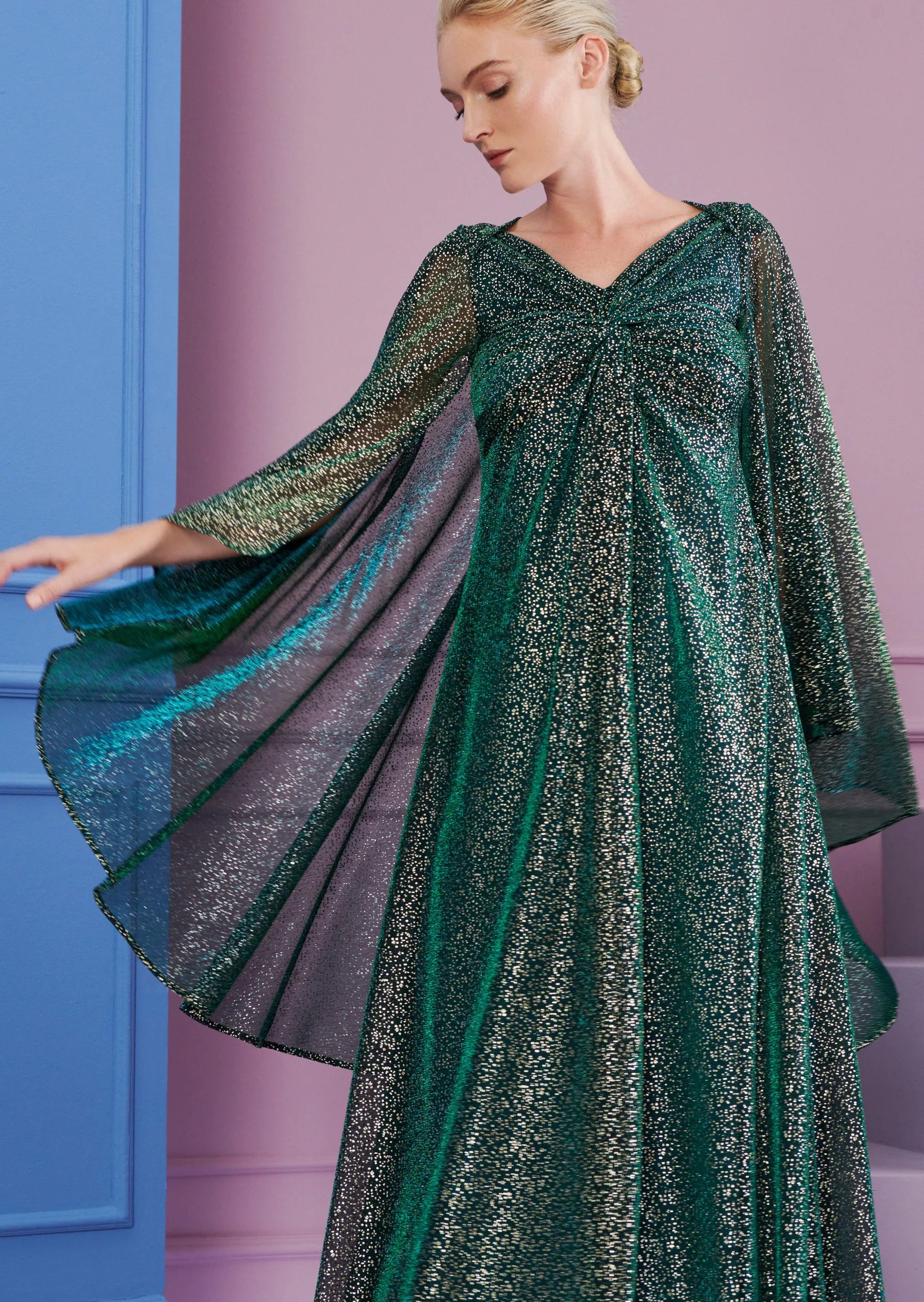 In diesem bodenlangen Abendkleid gehen Sie glatt als Film-Diva aus Hollywood durch. Denn hier haben unsere Designer einen richtigen Boho-Look gezaubert: Diese Abendrobe setzt nicht auf eine figurbetonte Silhouette, sondern bringt als A-Linie, wie ein Kaftan, eine spielerische Leichtigkeit mit. Das Material, ein glitzernder Metallic Voile wird hier scheinbar miteinander verknotet. Hinten sorgt ein fließendes Cape für Dramatik. Mit diesem Look werden Sie zur mondänen Gastgeberin auf Ihrer nächsten Party. Nur eins dürfen Sie dann nicht vergessen: den großen Auftritt auf Ihrer hauseigenen Showtreppe!