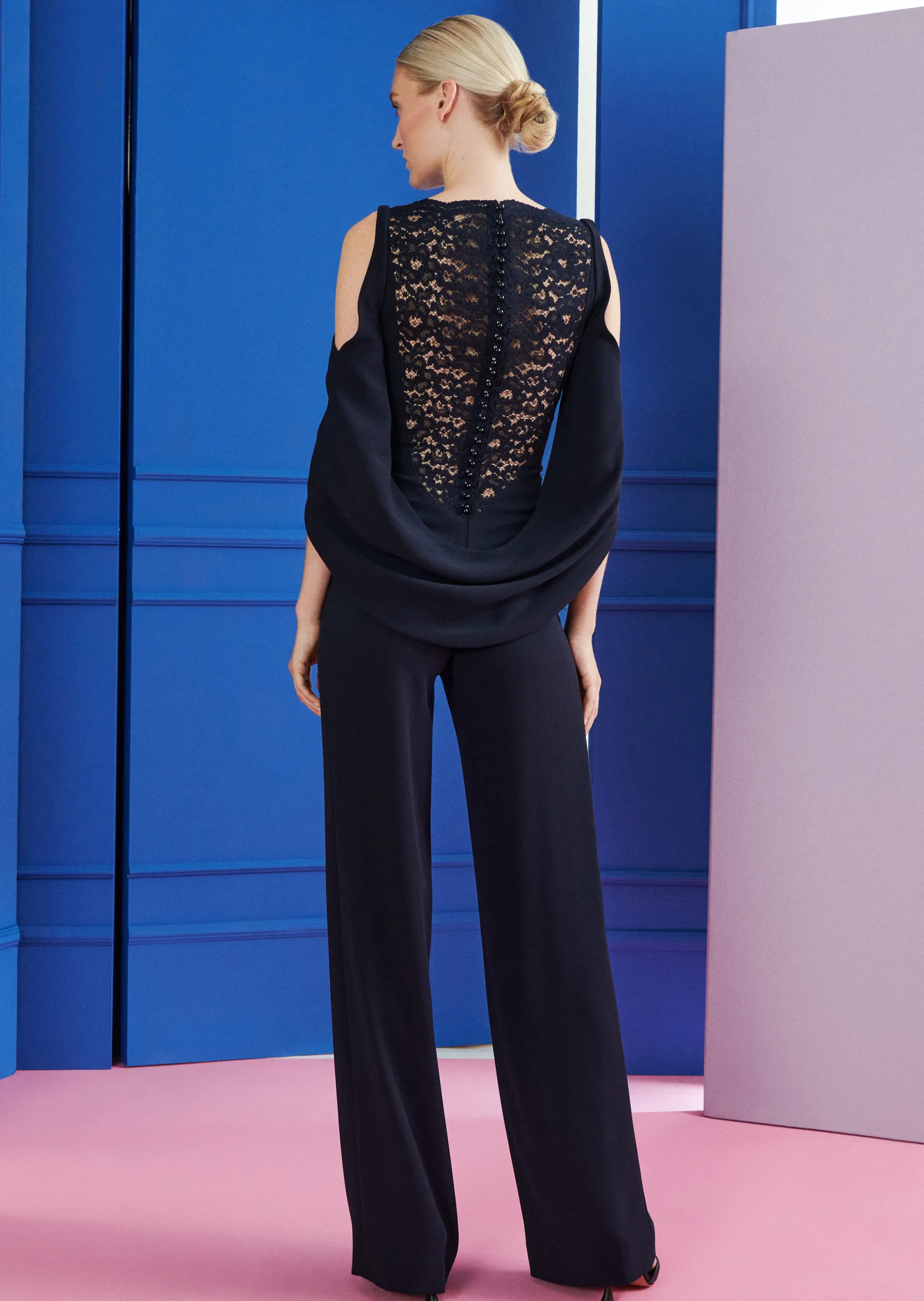 kleid oder hose? in unserem overall wird das beste aus beiden welten auf handwerklich meisterhafte art miteinander versöhnt. eine starke cold shoulder und ein raffinierter infinity-sleeve verleihen ihnen haltung und würde, während die edle spitze im rücken mit der verführerischen detailverliebtheit einer ballrobe anmutet — und alle blicke auf sie lenkt. ob zum gala-bankett oder zum feiern in die schickste bar der stadt, dieser Jumpsuit verträgt den großen auftritt. greifen sie deshalb gern zu schwindelerregend hohen pumps, schwerem schmuck und smokey eyes, wenn es ihnen gefällt.