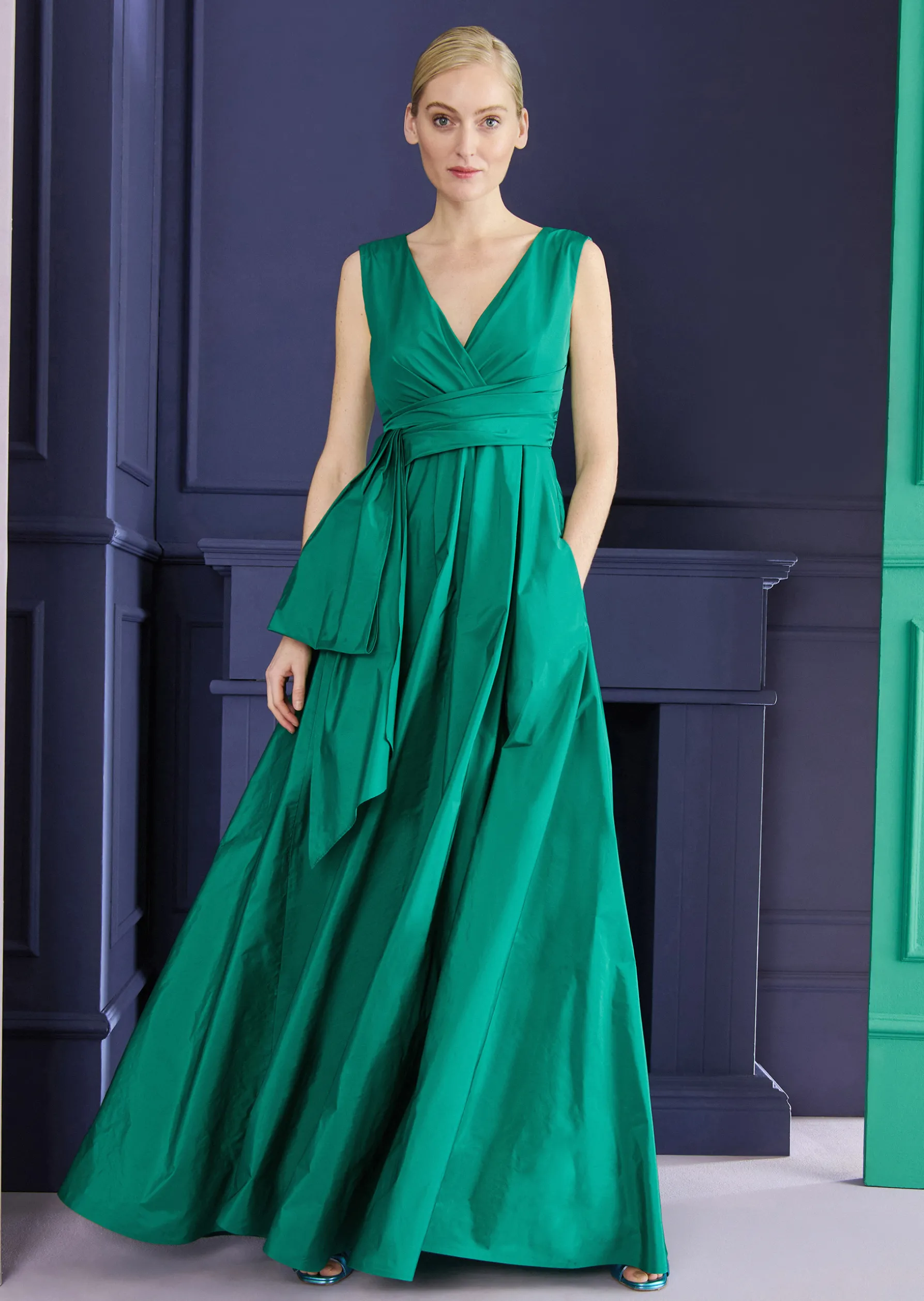 Übertriebener Sex-Appeal? Darauf verzichtet dieses Abendkleid komplett. Stattdessen steht hier die Lässigkeit im Fokus, mit der Sie es auch tragen werden. Der Stoff, ein leichter Taft verleiht diesem bodenlangen Kleid seine Modernität. Der V-Ausschnitt und das drapierte Schleifendetail feiern Ihre feminine Seite. Die obligatorischen Taschen bieten Platz für ihren Lippenstift, oder gleich – ganz cool – für ihre Hände. Hier brauchen Sie sich keine Sorgen über Transparenz, sichtbare Wäsche oder sonstige Blitzlicht-Sperenzchen zu machen. In diese Robe schlüpfen Sie einfach hinein, schließen den Reißverschluss und sehen schlicht fabelhaft aus.