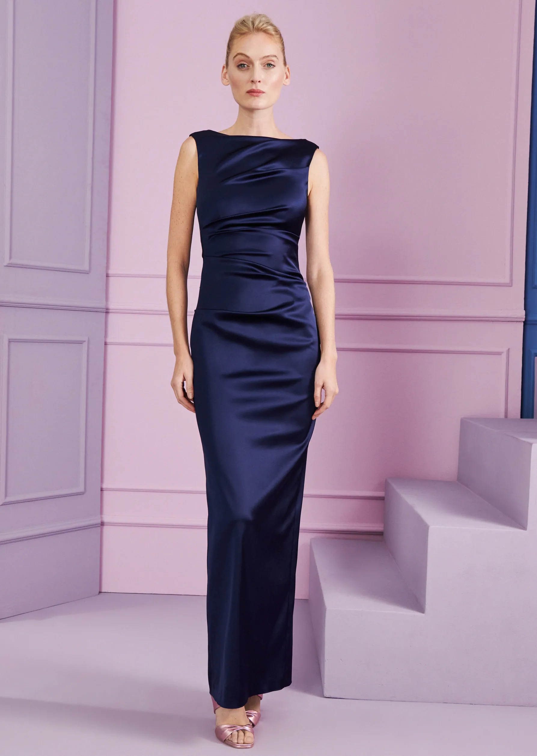 langes abendkleid aus stretch satin duchesse, farbe royal navy blau