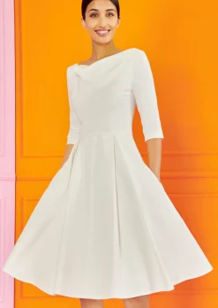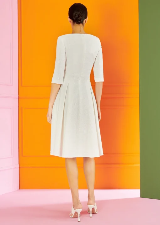 Kiss from a Rose… Irgendwie haben wir bei diesem Modell aus leichtem Cotton Waffle Piqué sofort die bekannte Liebesballade im Ohr. Denn eine wunderschöne Rose ziert hier das Oberteil. Diese wurde aber nicht einfach nur angenäht, sondern entwickelt sich in einem kunstvollen Schnitt aus dem Oberteil. Halblange Ärmel bedecken die Oberarme. Die Taille ist schmal akzentuiert. Der Rock springt nach unten weit auf. Kellerfalten sorgen hier sogar noch für zusätzliche Weite, was diesem knielangen Kleid seinen besonders femininen Look verleiht. Das perfekte Kleid für’s Standesamt. Spätestens dort bekommen Sie dann zusätzlich zur „Rose“ auch Ihren „Kiss“.