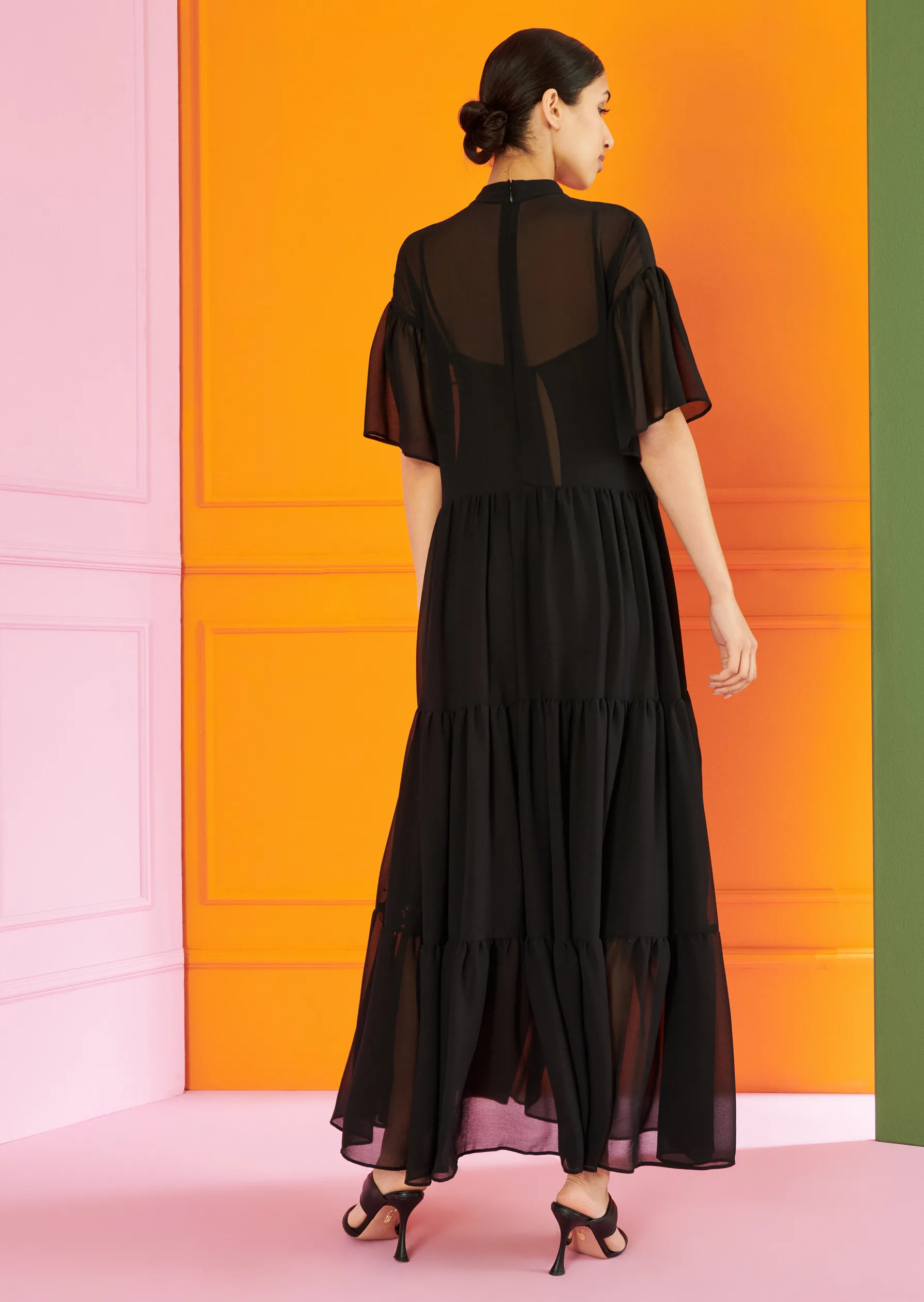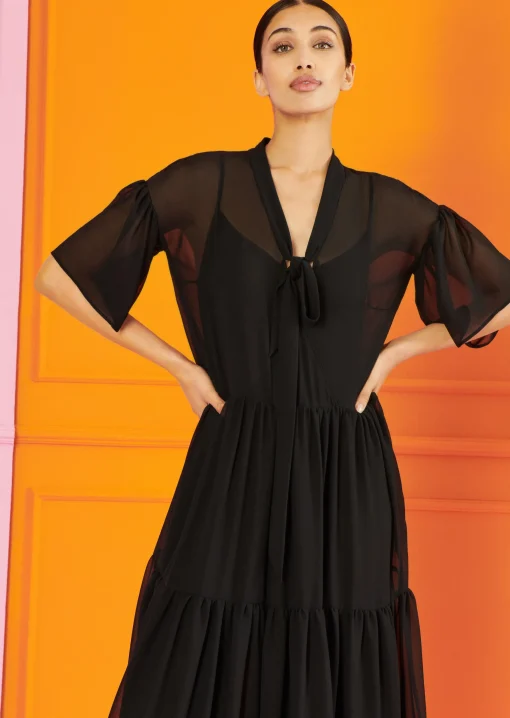 Einen eleganten und doch verspielten Boho-Look haben unsere Designer hier für Sie kreiert. Die locker geschnittene Maxilänge ist außergewöhnlich, aber doch so lässig –vor allem wenn Sie dazu flache Schuhe tragen. Der V-Ausschnitt sorgt eine flatternde Schluppe für einen schicken Hingucker. Dazu fließt der stufig gestaltete Rock wunderschön in der Bewegung. Wir haben dieses Maxikleid aus einem zarten Chiffon gefertigt. Aber keine Sorge, ein knielanges Unterkleid sorgt hier dafür, dass nicht zu viel Haut durchschimmert. Ein toller Look fürs Klassik-Open-Air im Sommer, aber natürlich auch für viele andere festliche Gelegenheiten.