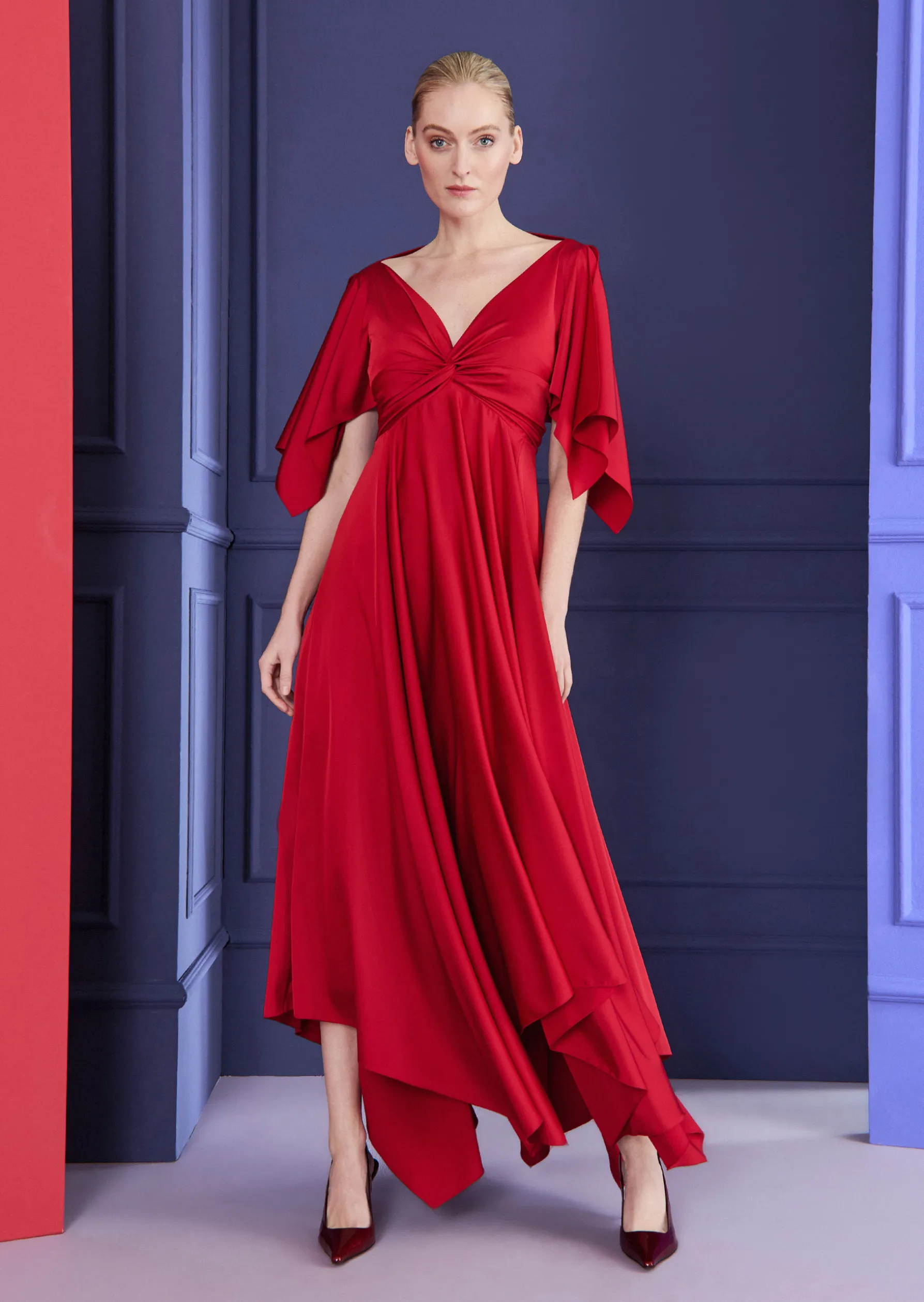 Lässigen Boho-Chic versprüht unser neues Midikleid. Das schöne Dekolleté mit dem raffinierten Knoten Drapé ist sexy und feminin. Die flatternden Ärmel wirken luftig und geben diesem Kleid eine verspielte Note. Dazu schwingt schön der lange, weite Rock – besonders beim Tanzen. Und wenn Sie auf der Tanzfläche zufällig der Spot trifft, schimmert der leichte Crepe Satin verspielt und geheimnisvoll. So ziehen Sie mit Sicherheit alle Blicke auf sich und werden zum Star auf jeder Hochzeitsparty oder dem nächsten Opening-Event in Berlin, Paris oder New York.