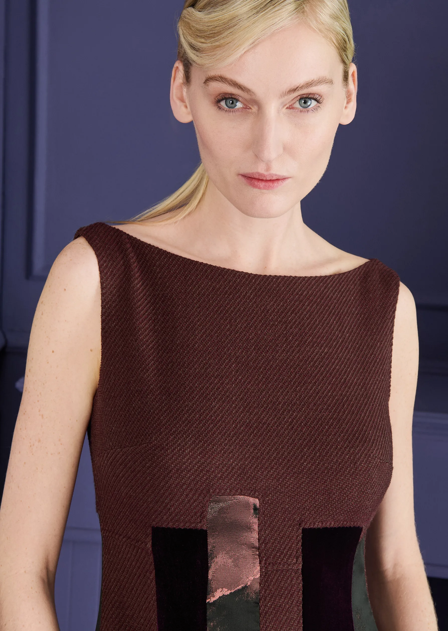 im gegensatz zum unifarbenen schwester-modell haben wir bei dieser version unseres midikleids den fokus stark auf den raffinierten bahnenschnitt gelegt. unterschiedlich lange streifen aus jacquard und samt in unterschiedlichen farben setzen sich hier zu einem femininen und super modernen cocktailkleid zusammen, so dass ein regelrecht mondäner look emtsteht mit asymmetrischem saum entsteht. die taille ist schmal, der ausschnitt hochgeschlossen. durch den ärmellosen schnitt tragen sie hierzu ganz entspannt einen samrblazer oder eine kurze lederjacke.