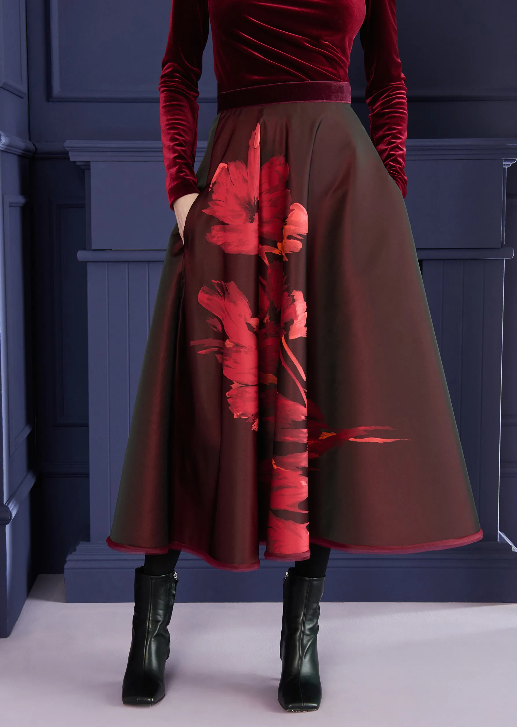 Mit Blumen ist alles schöner… Zum Glück ziert unseren neuen Midirock ein besonders opulentes Exemplar. Dieser wunderschöne Jacquard aus Frankreich ist schon allein ein kleines Meisterwerk. Besonders toll entfaltet dieser seine Wirkung hier schon durch den Schnitt. Wir haben diesen Rock nämlich im schrägen Fadenlauf konstruiert. So fällt der Stoff extra fließend. Durch den stretchigen Samtbund trägt sich unser Midirock auch noch total bequem, selbst wenn wieder ein langer Abend mit Gängemenü ansteht. Und selbst beim Styling bietet dieser Rock unterschiedlichste Optionen –von glamourös mit einem glitzernden Body gestylt bis zum cozy Eveninglook mit weichem Cashmerestrick.